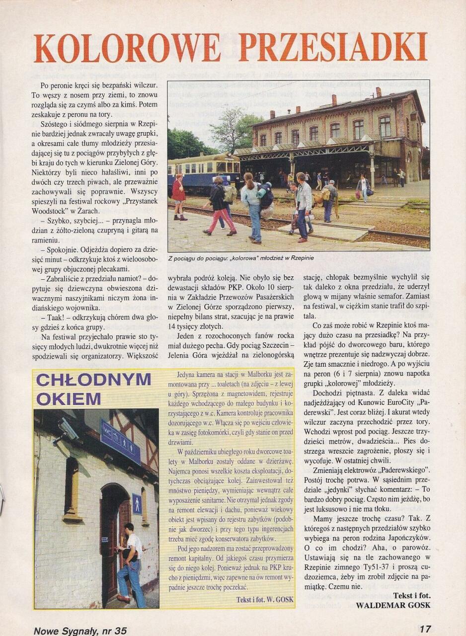 Skan artykułu z Nowych Sygnałów (35/98) o stacji Rzepin podczas "Przystanku Woodstock" oraz monitoringu na stacji w Malborku.