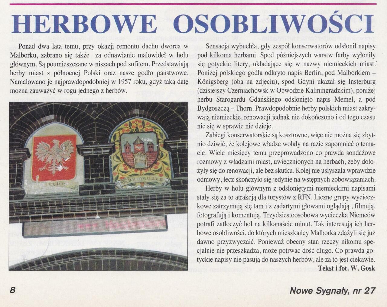 Skan artykułu z Nowych Sygnałów nr 27/98 o herbach w holu dworca w Malborku.