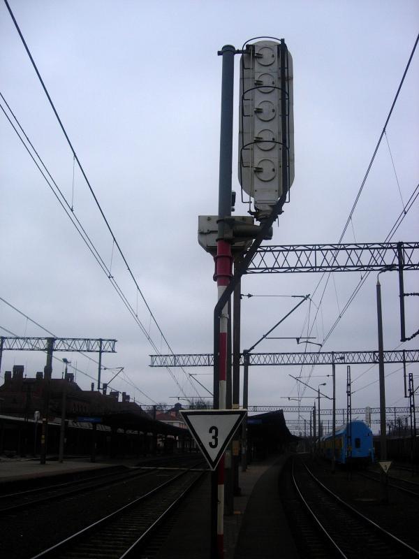 Semafor świetlny wyjazdowy na tle stacji w Malborku.
