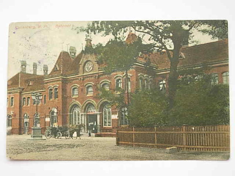 Budynek dworca. Kolorowa pocztówka z początku XX wieku.