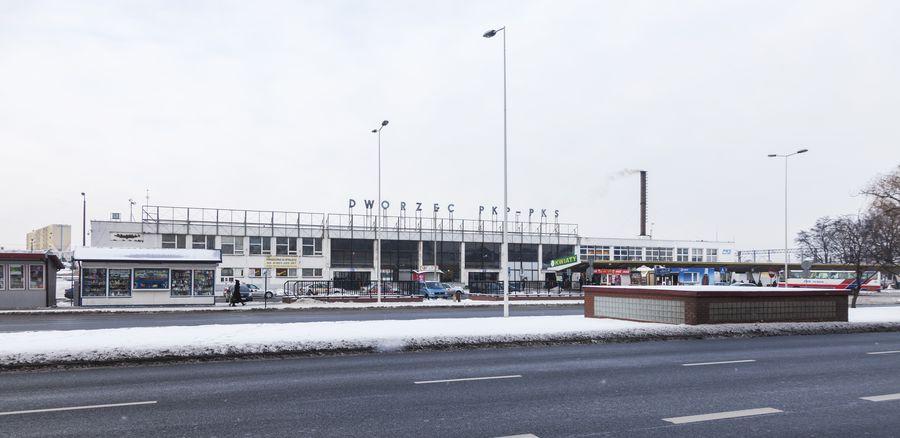 Nowy dworzec już czynny, typowy betonowy klocek.