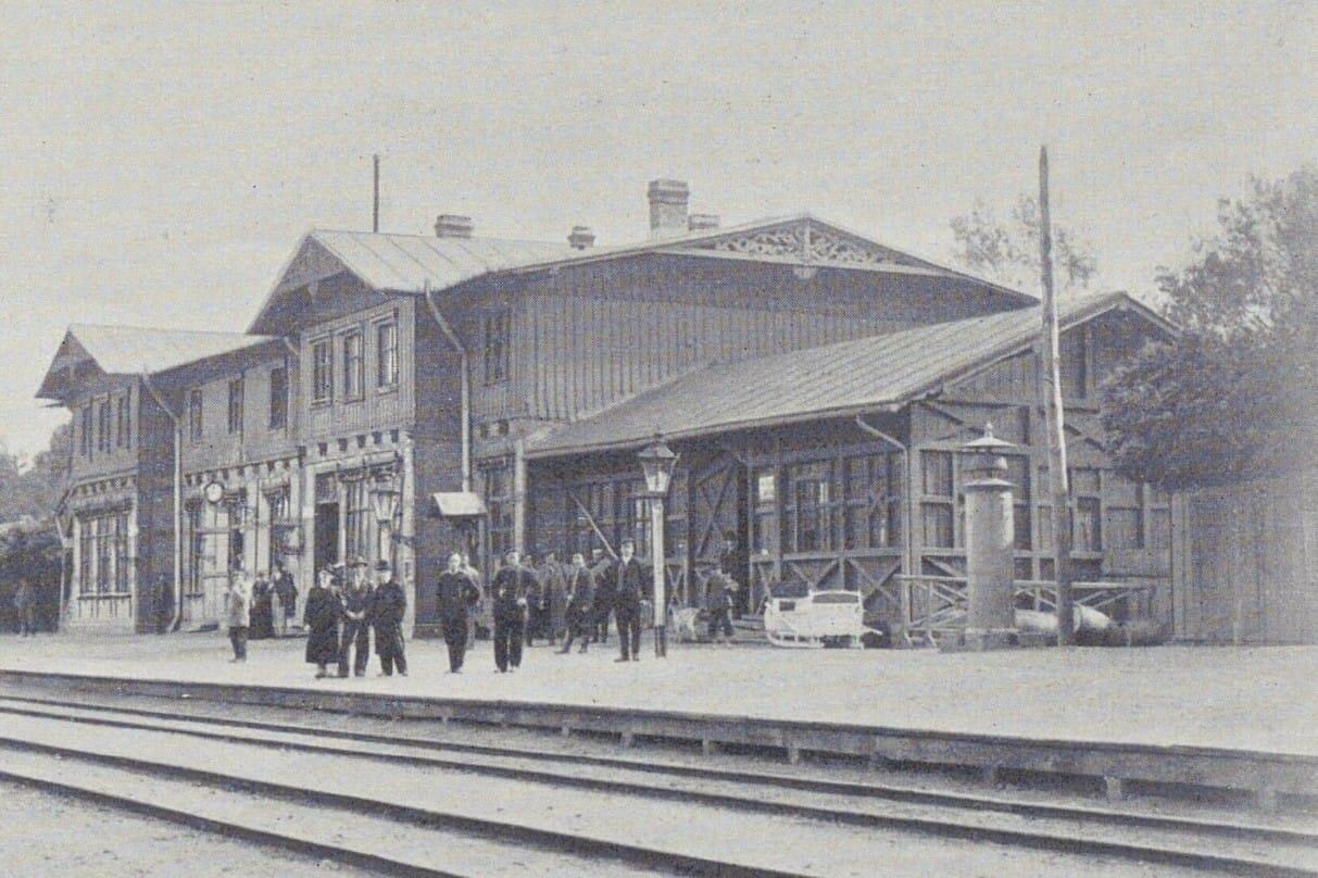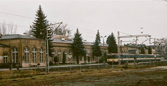 Elewacja budynku dworcowego z nazwą stacji widziana od strony peronu. Zdjęcie (fragment większego ujęcia) pochodzi z prywatnej kolekcji wysyłającego.