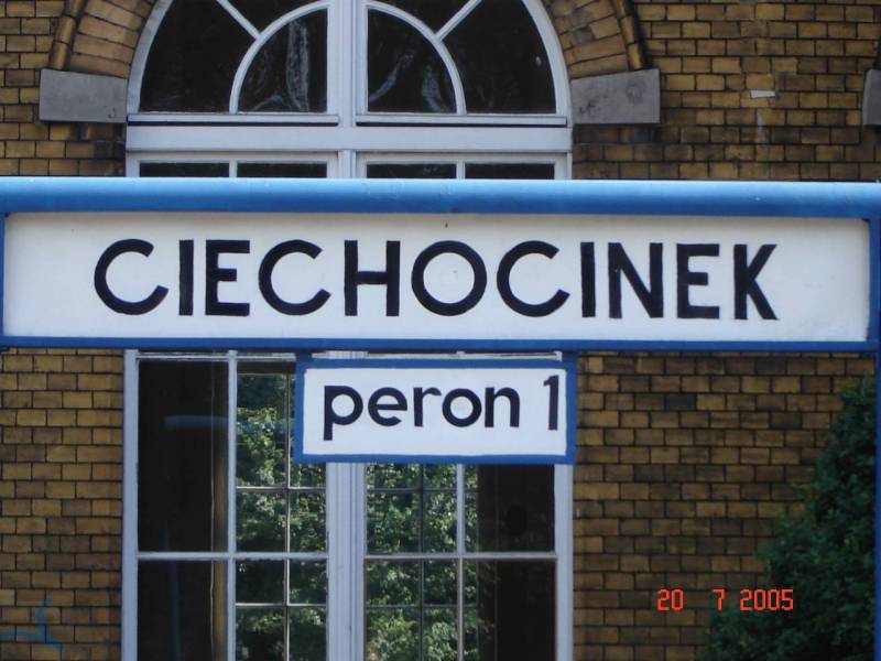 Stacja PKP Ciechocinek. Tablica z nazwą stacji na peronie 1.