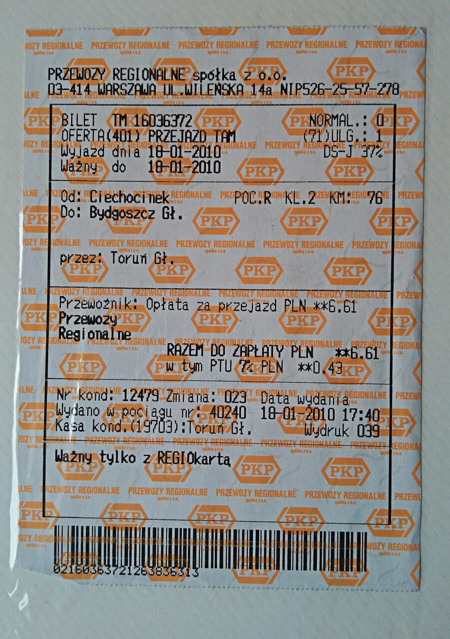 Bilet z Ciechocinka do Bydgoszczy Głównej wydany w pociągu w Ciechocinku.