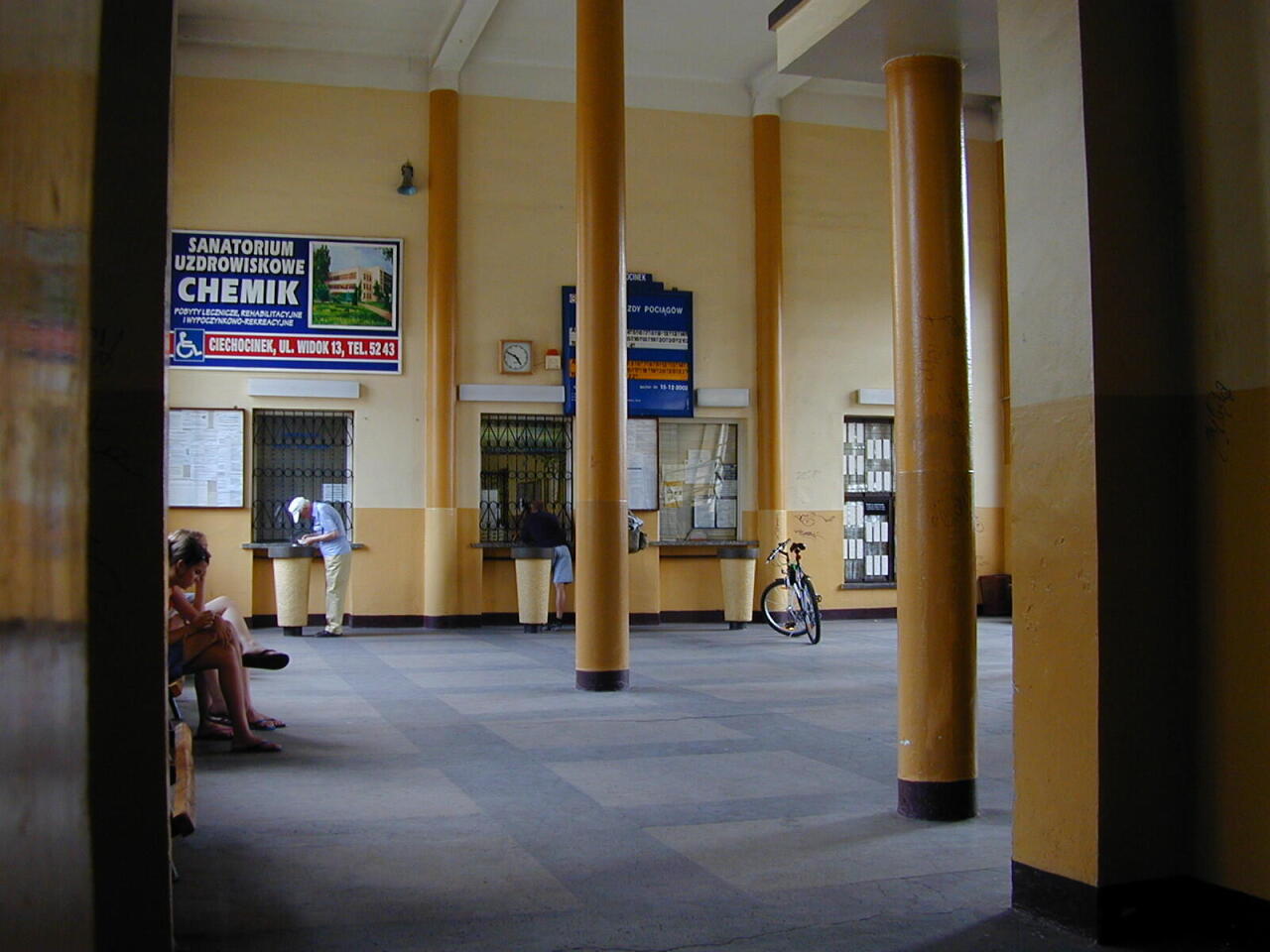 Ciechocinek. Wnętrze zabytkowego budynku. Czynnej kasy brak, za to jest… drogeria.
