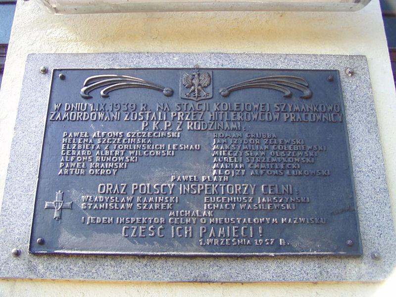 TABLICA UPAMIĘTNIAJĄCA ZAMORDOWANYCH KOLEJARZY PRZEZ HITLEROWCÓW W DNIU 1.IX.1939 R. NA STACJI SZYMANKOWO.