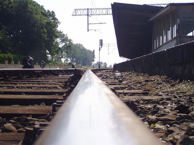 Widok z szyny na peron i boczne torowisko