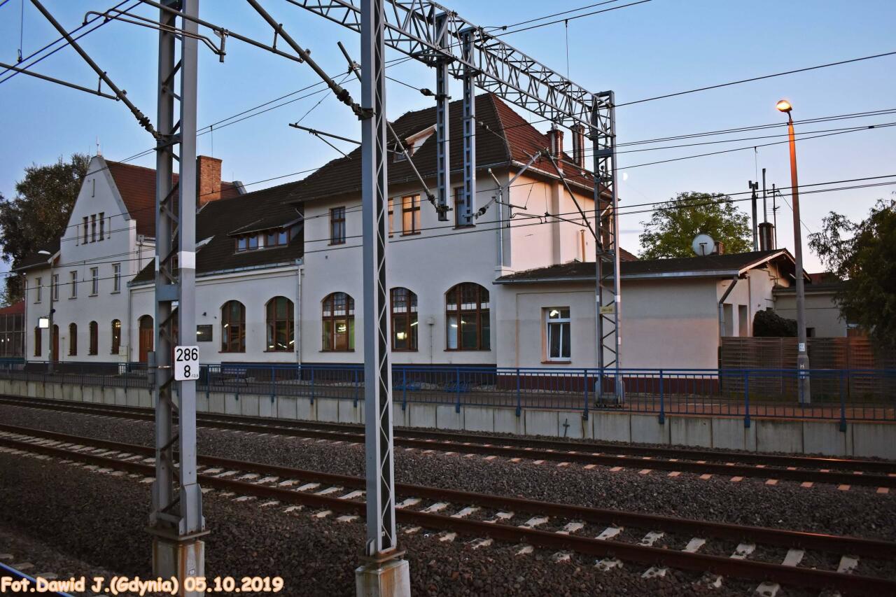 Budynek dworcowy widoczny od strony torów. W lewo Malbork i Nowy Dwór Gdański, w prawo Tczew.