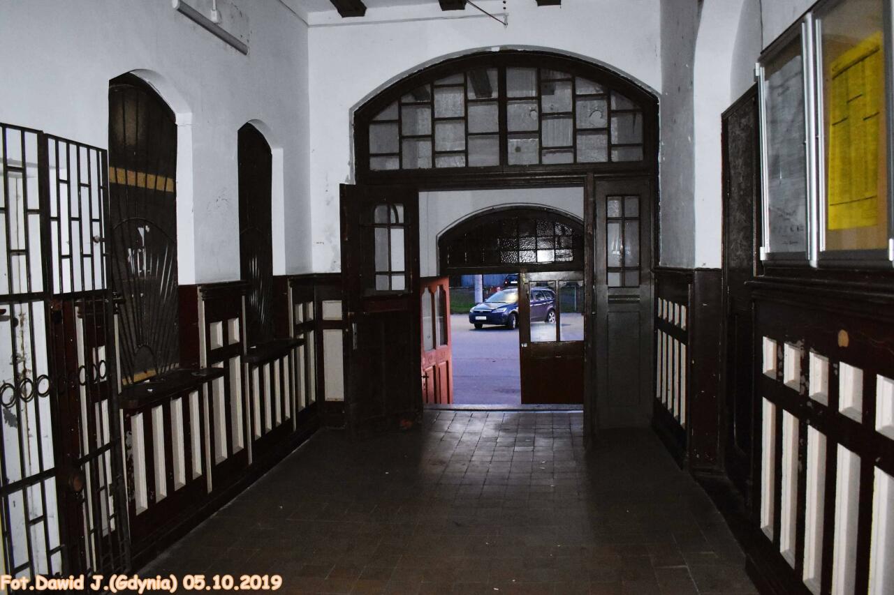 Wnętrze budynku dworcowego. Poczekalnia dla podróżnych. Nieczynne okienka kas biletowych znajdują się po lewej stronie. Wyjście do miejscowości.