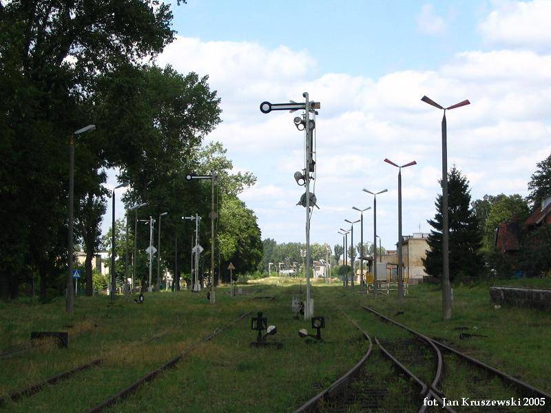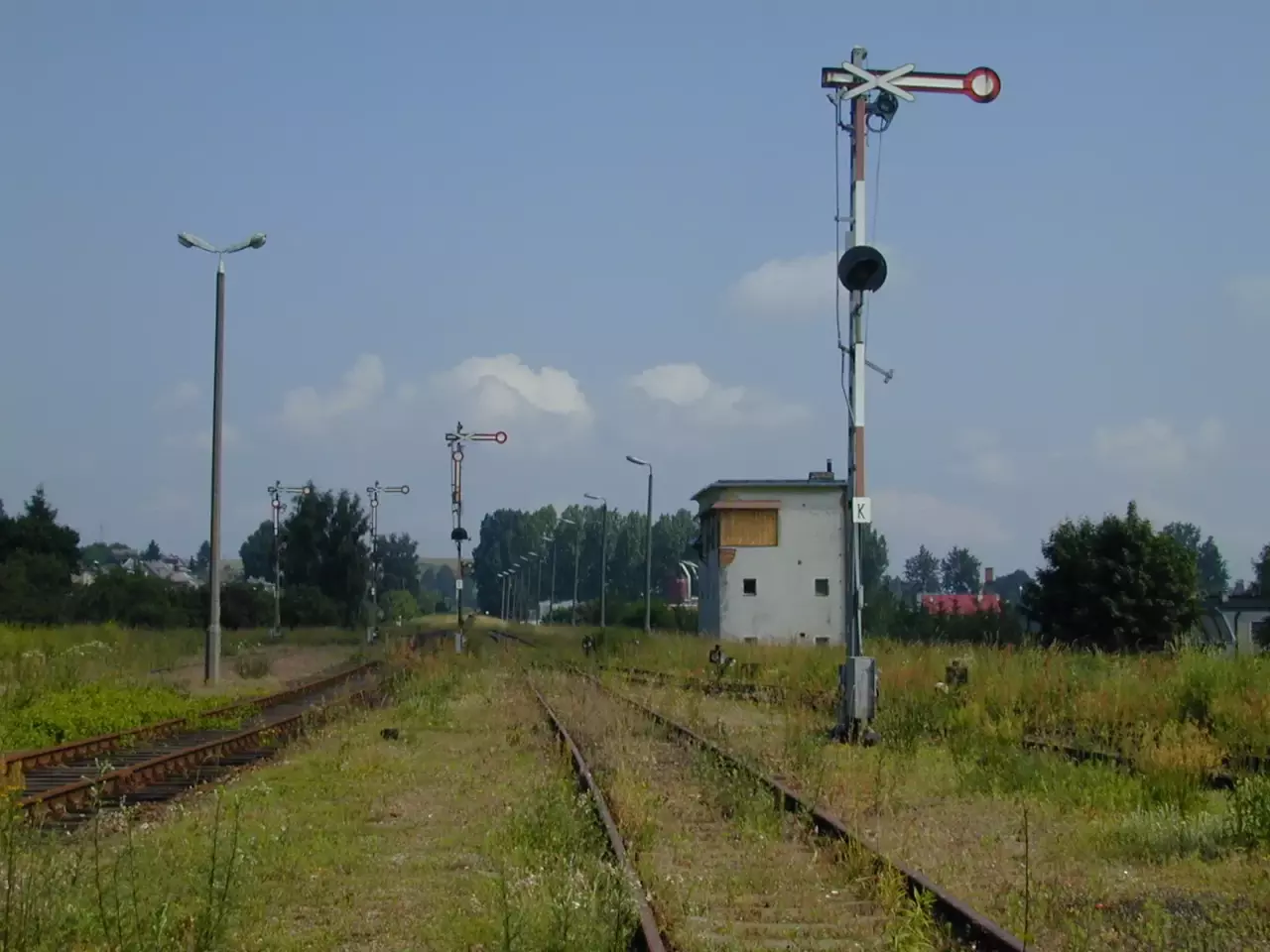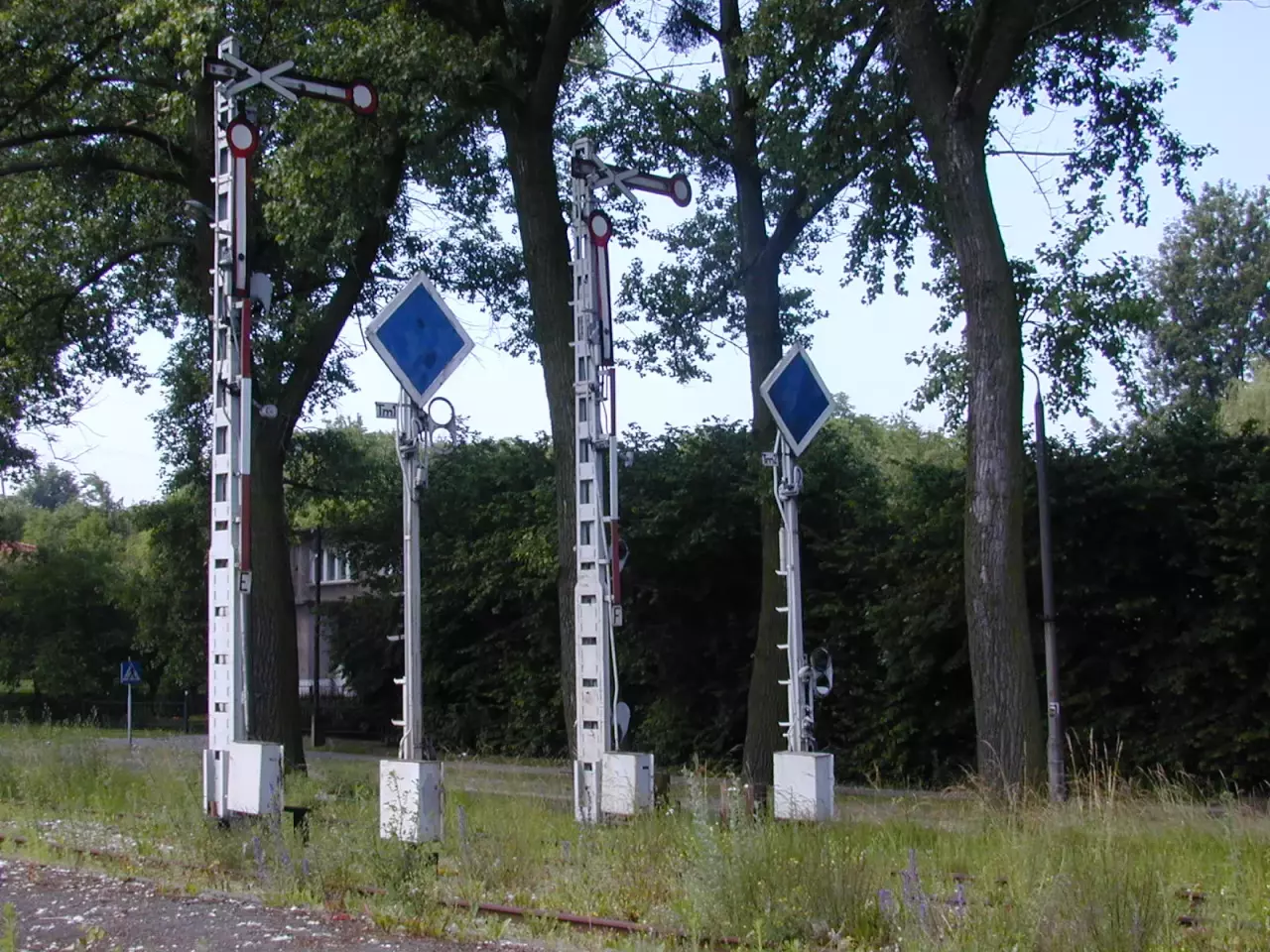 Kształtowe tarcze manewrowe i unieważnione semafory na stacji.
