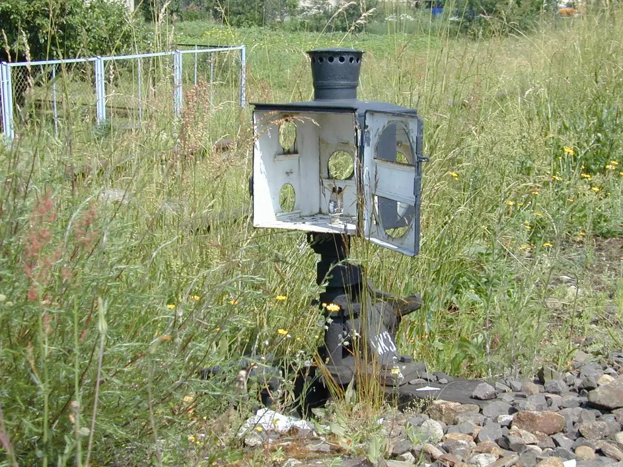 Otwarta i wypatroszona latarnia wykolejnicy WK3. Lokalizacja możliwa na schemacie stacji - obecnie nieznana.