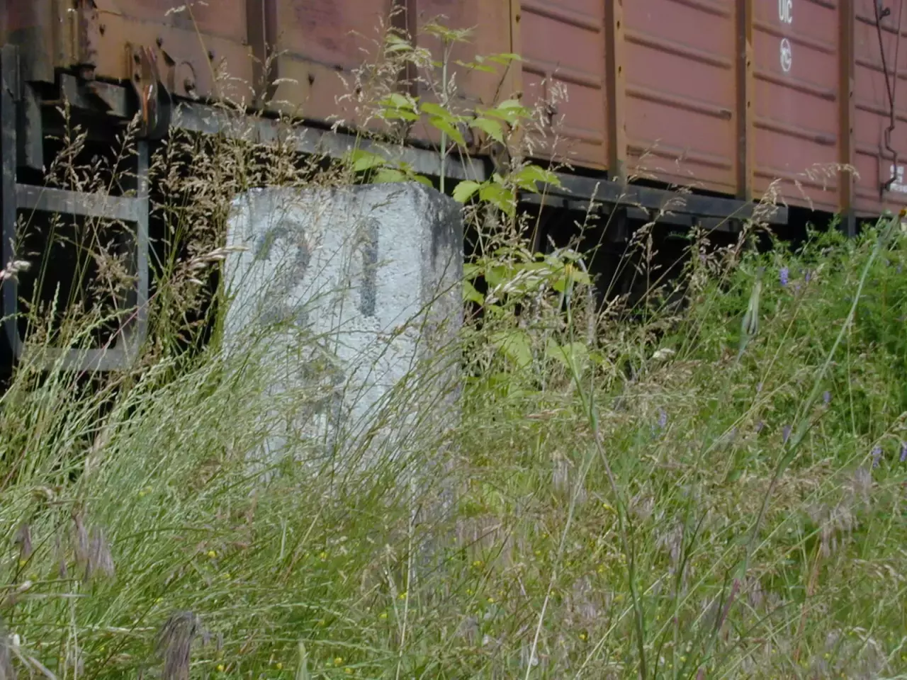 Słupek hektometrowy 21,3 zarastający trawą. W tle wagon towarowy kryty Gbs.