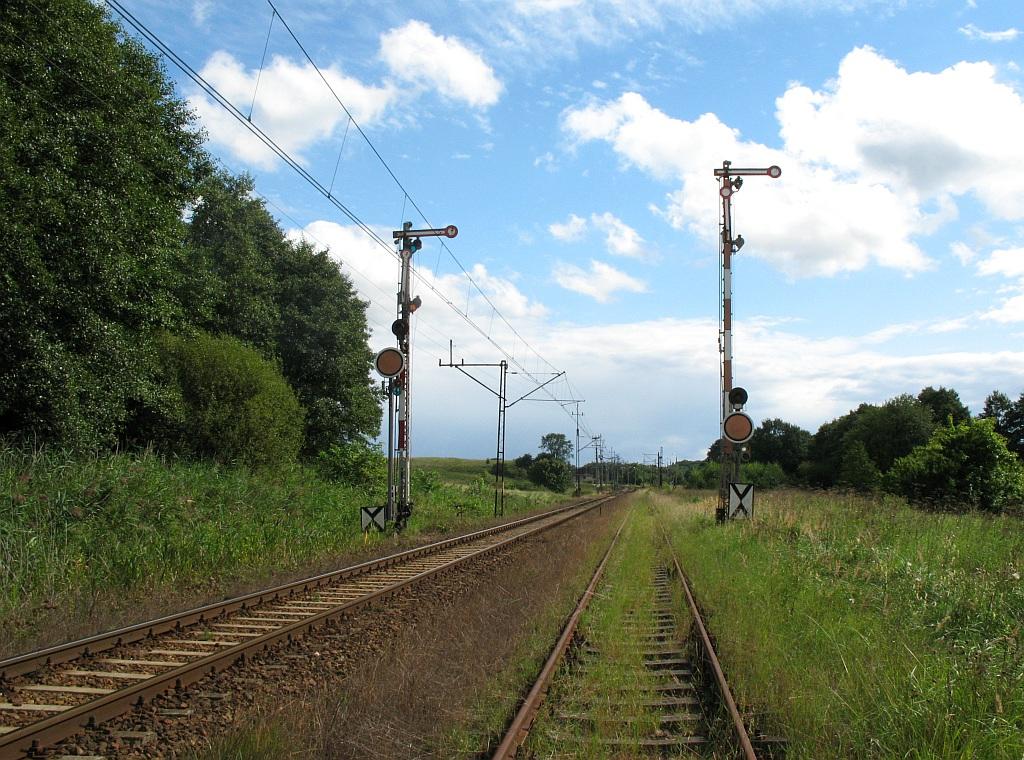 Semafory wjazdowe od strony Pasłęka. Toru po linii do Malborka już od 4 lat nie było, a semafor wjazdowy się ostał.