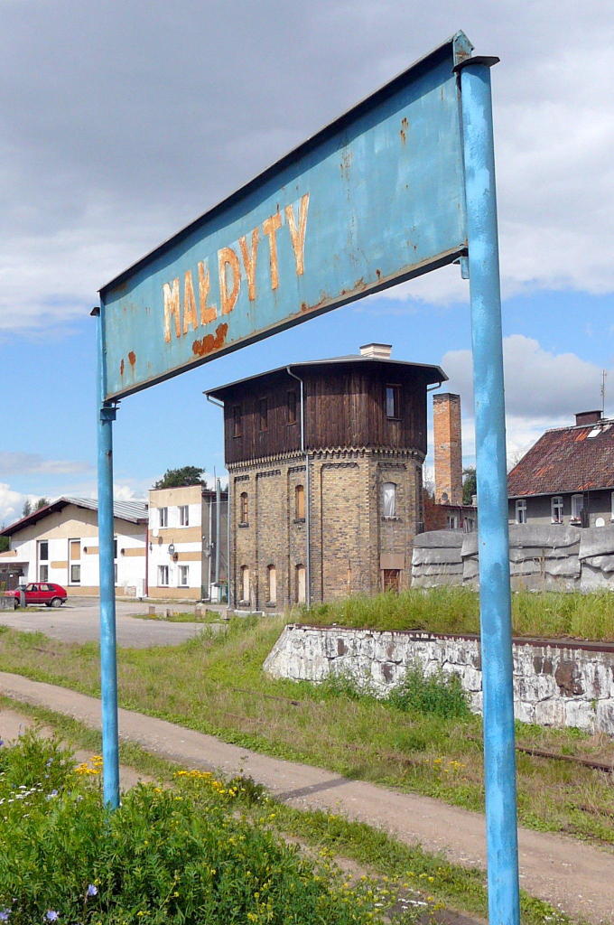 Małdyty. Wieża wodna pod nazwą stacji i rampa towarowa.