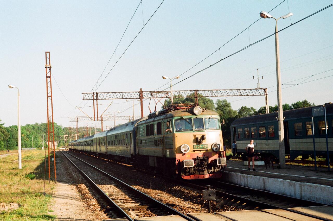 Stacja Małdyty - tor 1, peron 2 - pociąg PE 15115 relacji Kuźnica Białostocka - Gdynia Główna Osobowa, prowadzony lokomotywą EP07-426 (MT Olsztyn), na dalszym planie z lewej strony nastawnia wykonawcza "Md1". Widok w kierunku stacji Morąg/Olsztyn Główny.