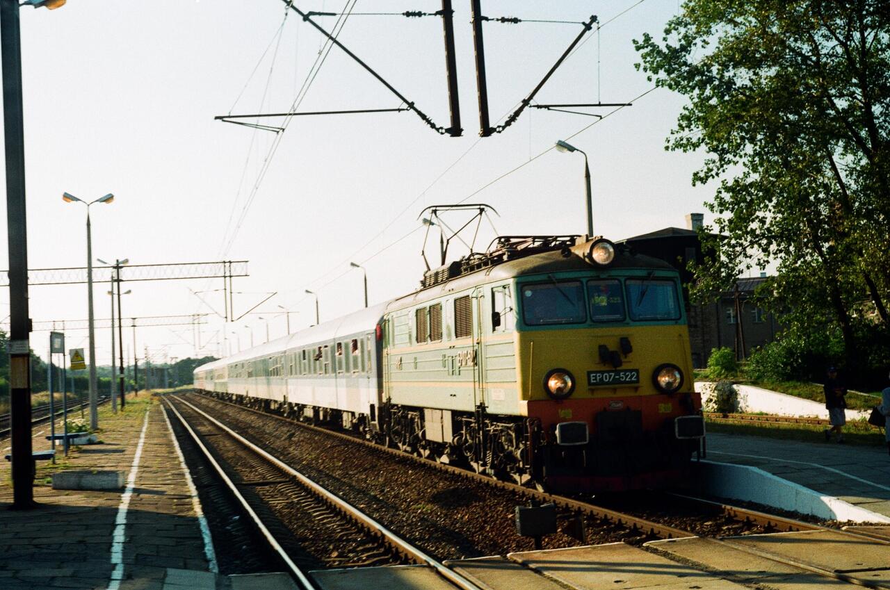 Stacja Małdyty - tor 3, peron 1 - pociąg PE 85302 (IR 328) "MARE BALTICUM" relacji Berlin Lichtenberg - Olsztyn Główny, prowadzony lokomotywą EP07-522 (MT Szczecin). Widok w kierunku Elbląga i Myślic/Malborka.