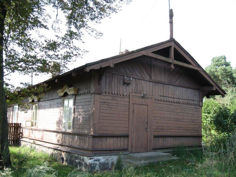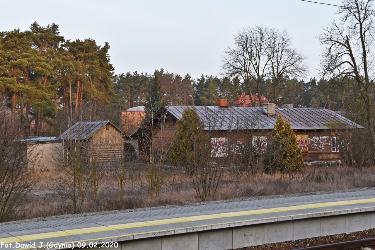 Budynek dworcowy i pobliski budynek gospodarczy. Obiekty widoczne od strony torów. W lewo Tłuszcz; w prawo Wyszków, Ostrołęka.