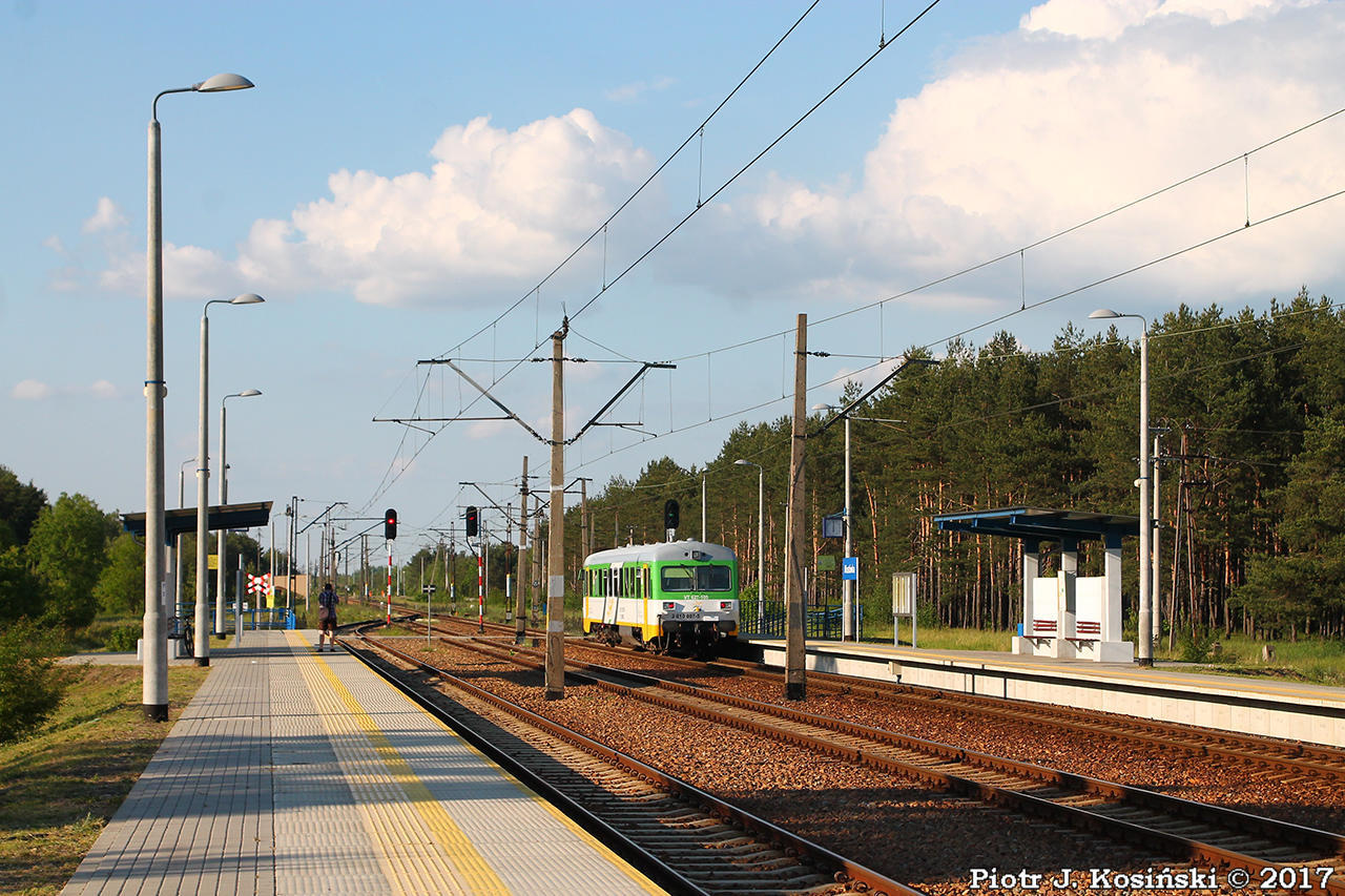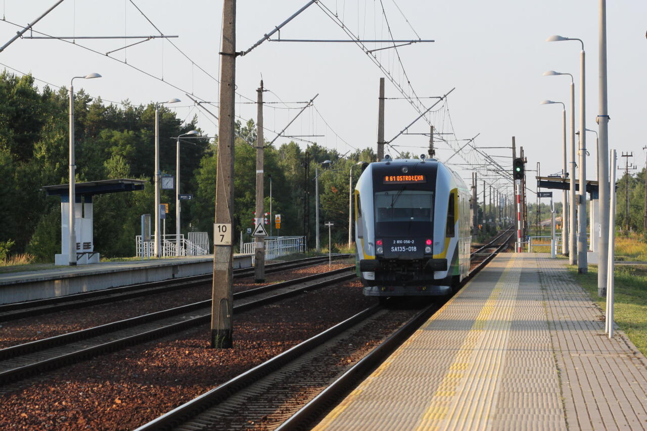 Stacja Mostówka - tor 1, peron 1 - pociąg ROJkm 91655 relacji Tłuszcz - Ostrołęka, obsługiwany elektrycznym zespołem trakcyjnym EN57-038 (Koleje Mazowieckie - Sekcja Napraw i Eksploatacji Taboru Tłuszcz), widok w kierunku stacji Tłuszcz.