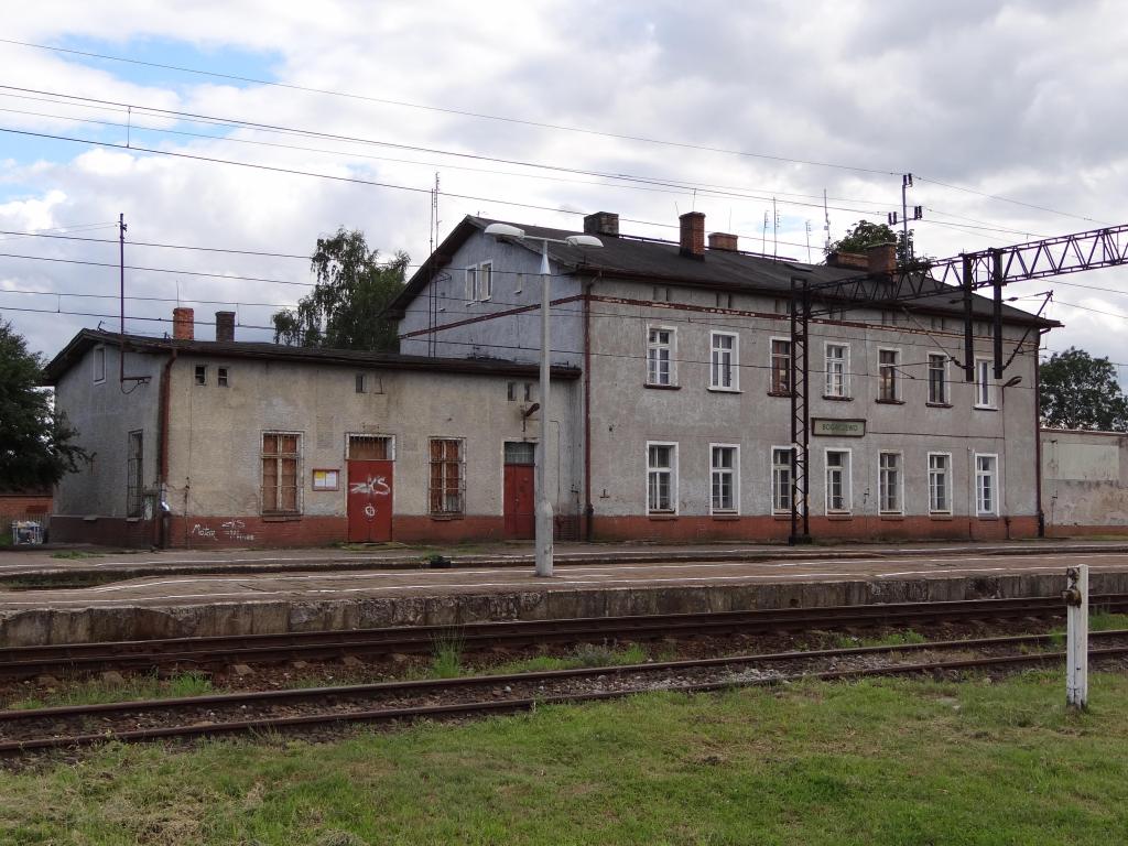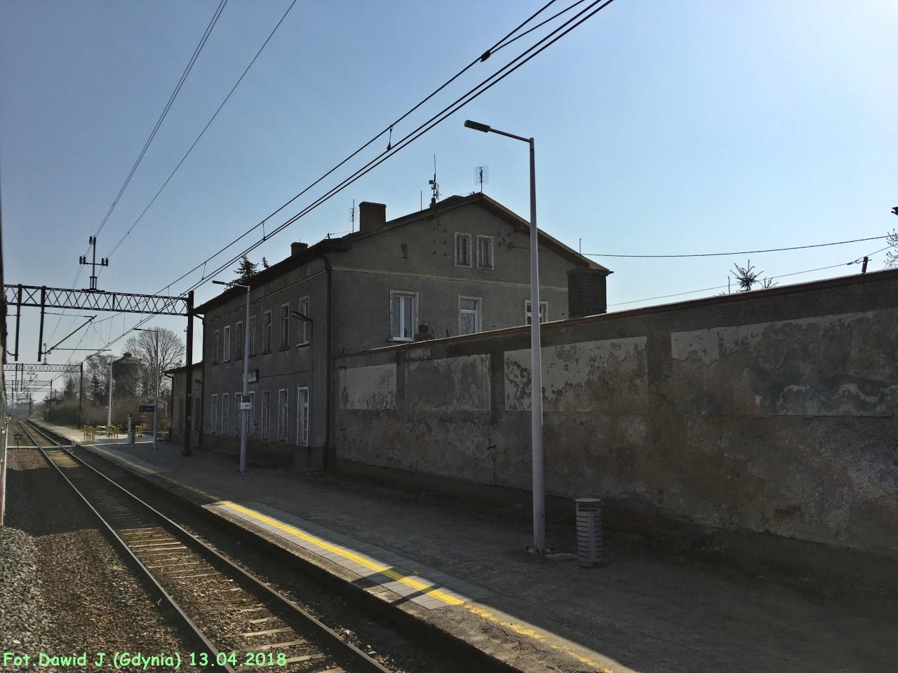 Widok z peronu 1 w kierunku Elbląga/Malborka. Budynek dworcowy znajduje się po lewej stronie.