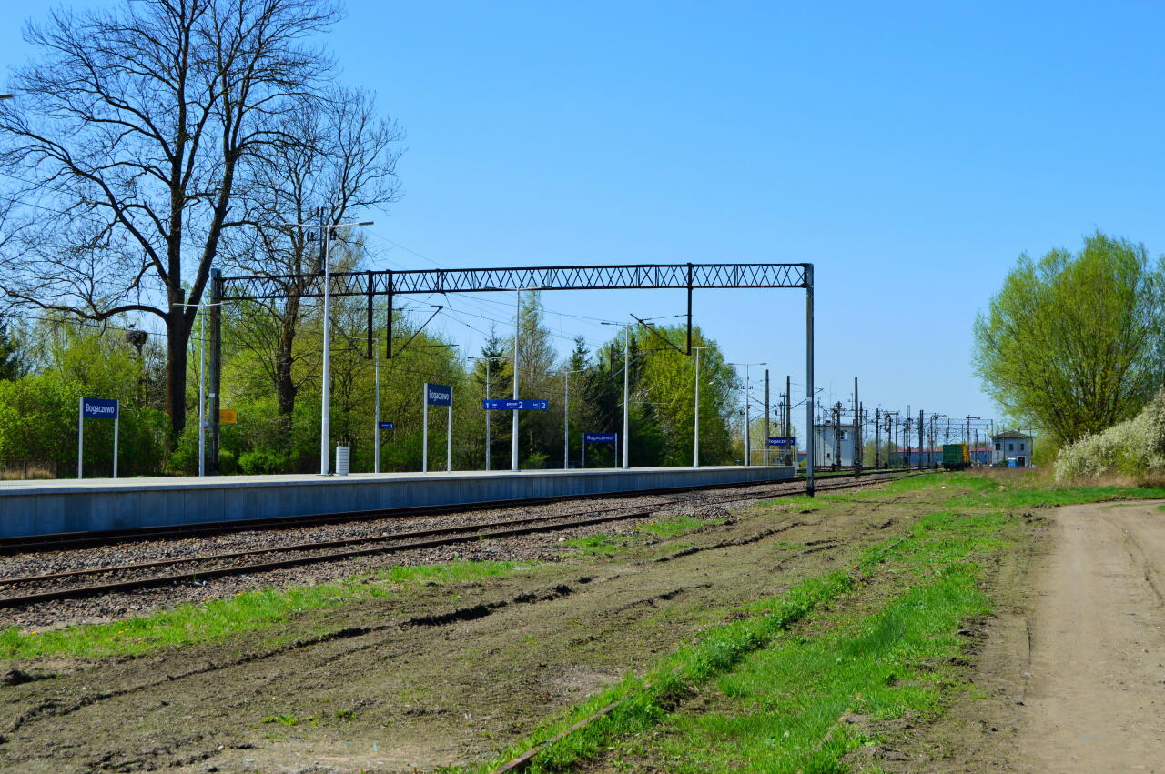 Zachodnia głowica rozjazdowa; wyjazd na Braniewo i Morąg. Widoczne wszystkie cztery semafory wyjazdowe. Przejazd drogowy w Bogaczewie (wschodni). Po lewej poza kadrem nastawnia wykonawcza Bc1. Widok w kierunku Braniewa i Morąga. 41,6 km/ 84,9 km.