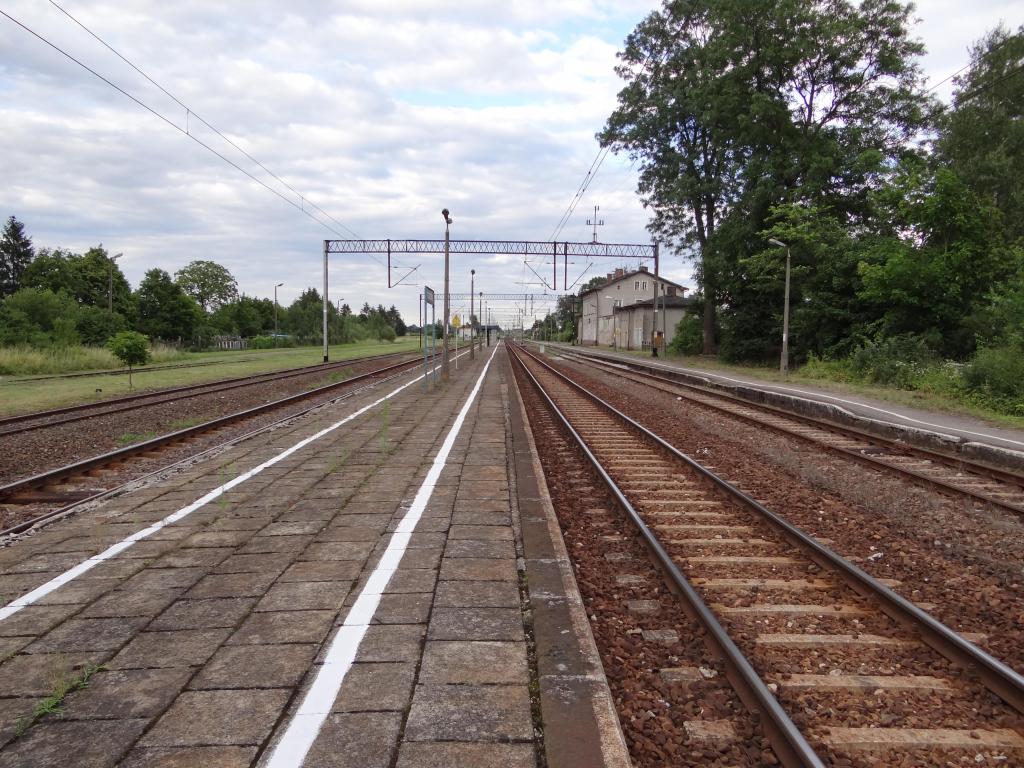 Peron pierwszy, boczny (po prawej) i peron drugi, wyspowy. Widoczny budynek dworcowy od strony peronów. Widok w kierunku Braniewa i Morąg. 41,2 km/ 85,3 km.