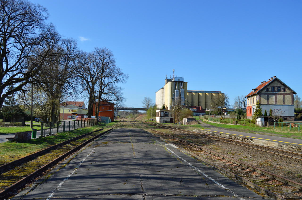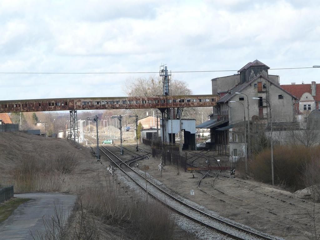 Wjazd na stację od strony Ornety/Olsztyna. Estakada nad torami łączy wytwórnię pasz (z prawej) z elewatorem zbożowym. W tle perony. Widok w kierunku północno-wschodnim.