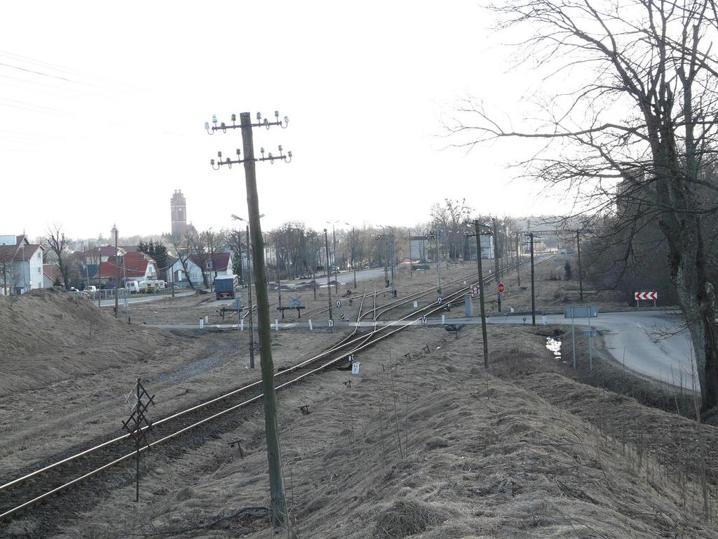 Wjazd na stację od strony Braniewa. Droga po lewej, to pozostałości po rozebranej w 1945 r. linii do obecnego Korniewa, w Obwodzie Kaliningradzkim. W tle przejazd kolejowy przez ul. Henryka Sienkiewicza.