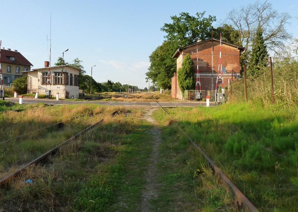 Przejazd kolejowy na wjeździe z Ornety/Olsztyna (z prawej). Z lewej strony kadru nastawnia dysponująca. W lewo perony. Widok w kierunku wschodnim.