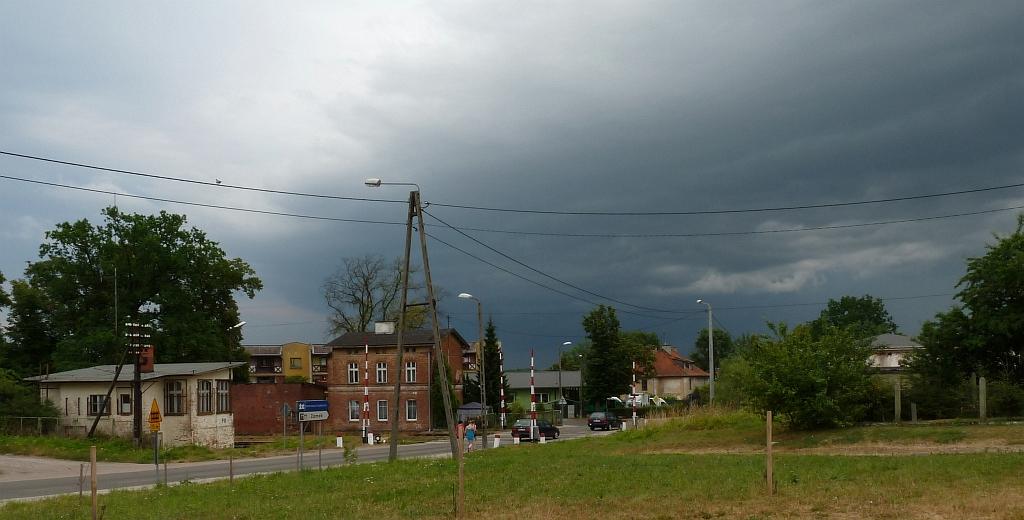 Przejazd kolejowy przez ul. Dworcową, na wjeździe z Ornety/Olsztyna. Widok w kierunku północno-wschodnim, w tle perony.