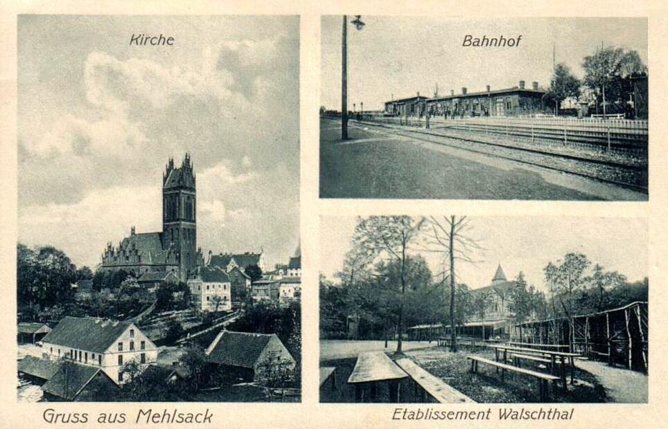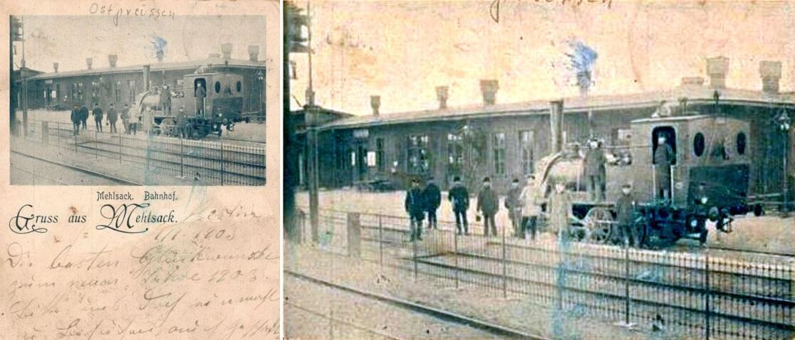 Kartka pocztowa ze zdjęciem stacji Mehlsack (Pieniężno), z parterowym dworcem barakowym. Po ok. 1910 r. dworzec ten został zastąpiony o wiele bardziej okazałym budynkiem murowanym, który jednak nie przetrwał końca wojny. Nowy dworzec powstał prawdopodobnie nieco bardziej na północ od widocznego na fotografii obiektu.