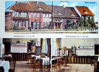 Niewielka fotografia, pozwalająca jednak ocenić, jak wyglądał w całości nowy, murowany dworzec, który zastąpił na stacji Mehlsack (Pieniężno), parterowy budynek typu barakowego. Na dole wnętrza poczekalni (Wartesaal), kl. I i II (po lewej) oraz kl. III i IV (po prawej). Datowanie fotografii do 1928 wynika głównie z tego, że w tym roku oficjalnie zniesiono kl IV na kolejach niemieckich (zakładając, że zdjęcia wnętrz poczekalni zrobione były w tym samym czasie co budynku dworca).