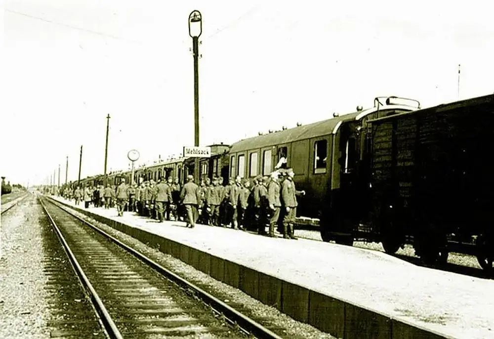 Perony stacji w czasie II wojny światowej. Widok w kierunku północno-wschodnim: Braniewo, Korniewo.