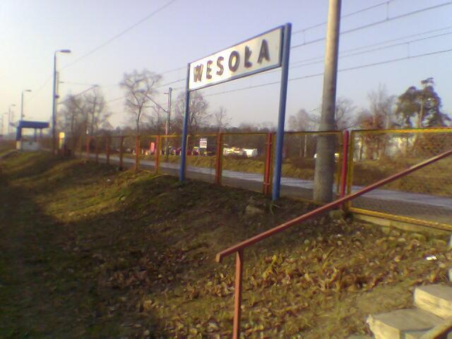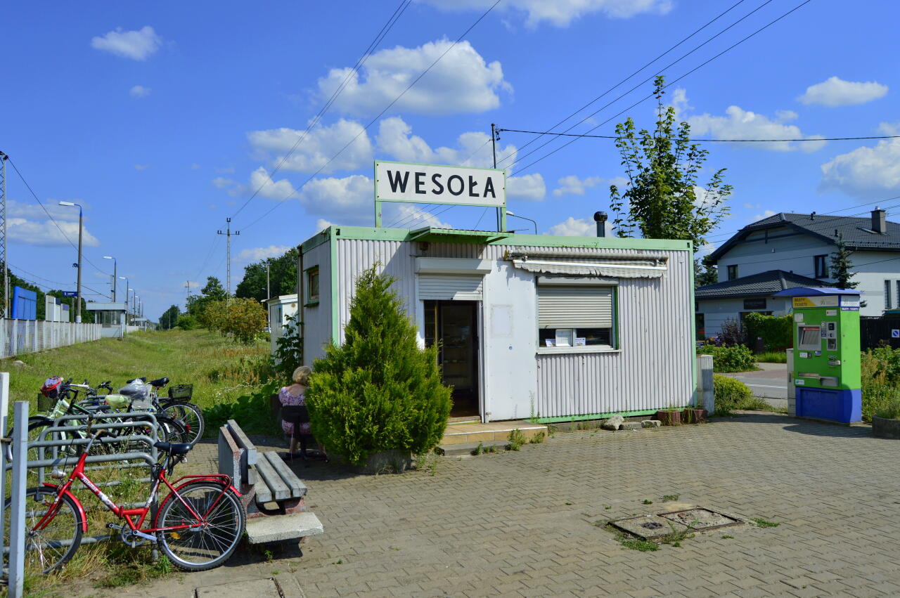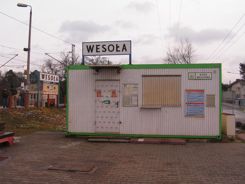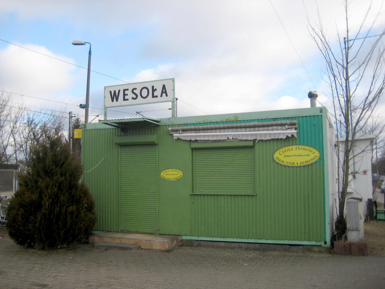 Budynek dawnej kasy biletowej. Obecnie kiosk spożywczy "Ciasta domowe". Na budynku nazwa przystanku, gdy Wesoła była samodzielnym miastem.
