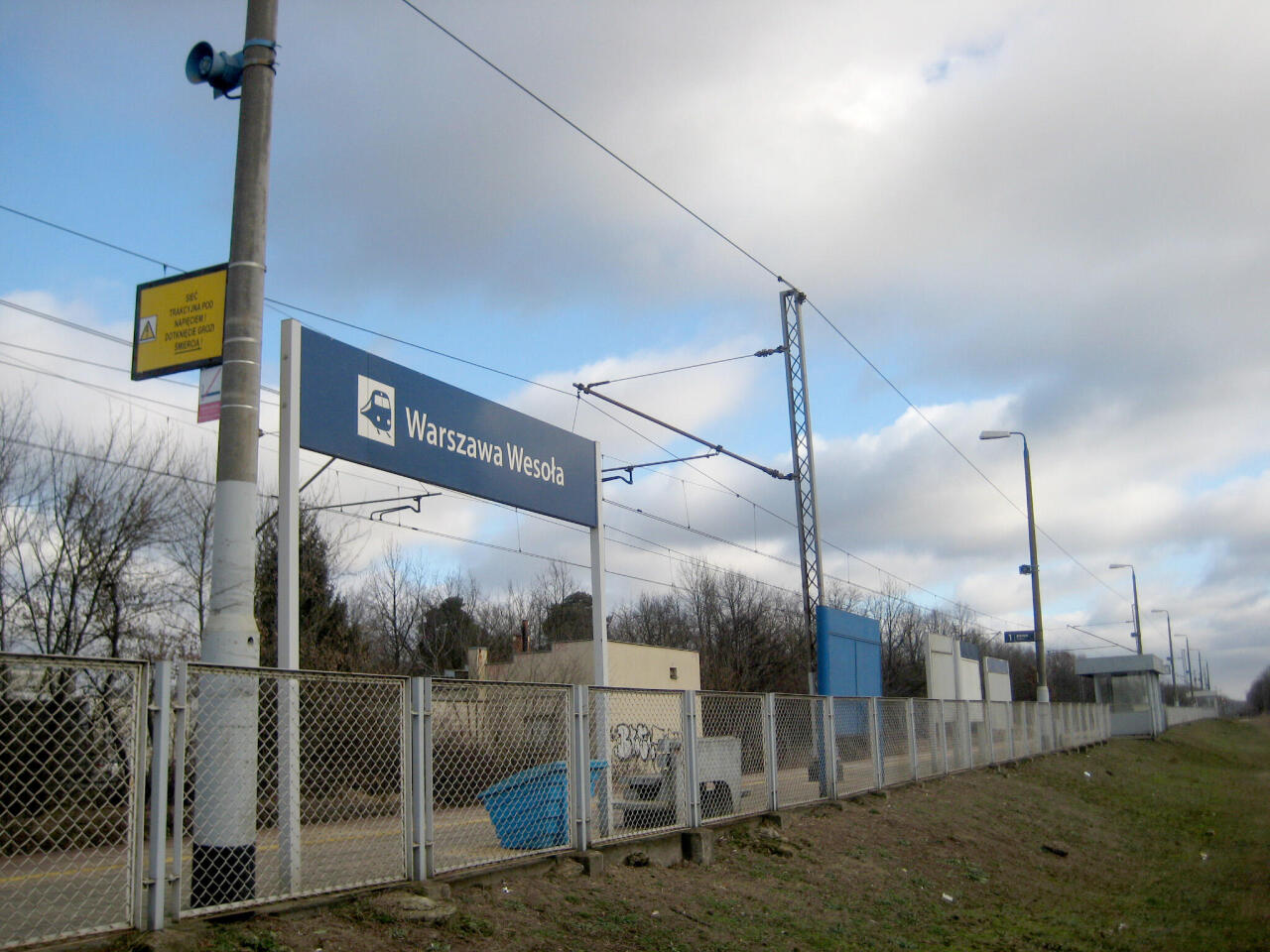 PKP Warszawa Wesoła. Tablica z nazwą stacji na peronie 1. Z tego peronu odjeżdżają pociągi w kierunku Siedlec.