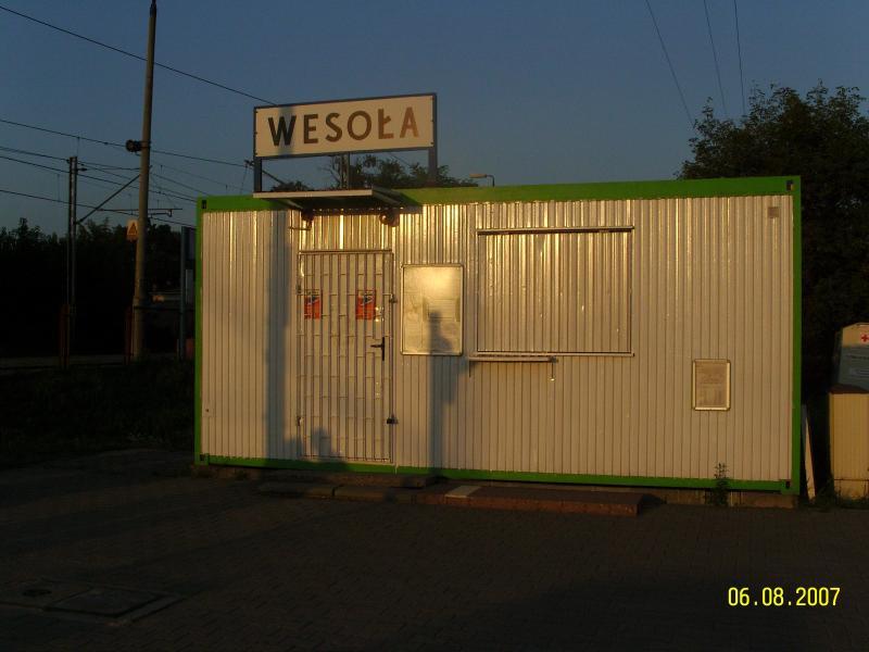 Opis ogólny: Budynek był, typowo dla stacji z lat 30-tych (wtedy przystanek był po raz pierwszy zmodernizowany) zlokalizowany na peronie i połączony z wiatą. W drugiej połowie lat 90-tych XXw, stacja była modernizowany w związku z przystosowywaniem linii E20 do dużych prędkości. Duży peron pomiędzy torami zastąpiły dwa perony po obu stronach. Opis infrastruktury: pod koniec lipca 2011 r. PKP Polskie Linie Kolejowe Spółka Akcyjna wymieniła wreszcie tablice peronowe na aktualne (zawierające aktualną nazwę przystanku "Warszawa Wesoła" jak na biletach, rozkładzie jazdy i wykazie tras). Na blaszaku pełniącym niegdyś rolę kasy, a następnie rolę kiosku z pieczywem, a obecnie zamkniętym w dalszym ciągu istnieje tablica ze starą nazwą "Wesoła". (info: Wesoła to też część Stolicy, 25-08-2011) |