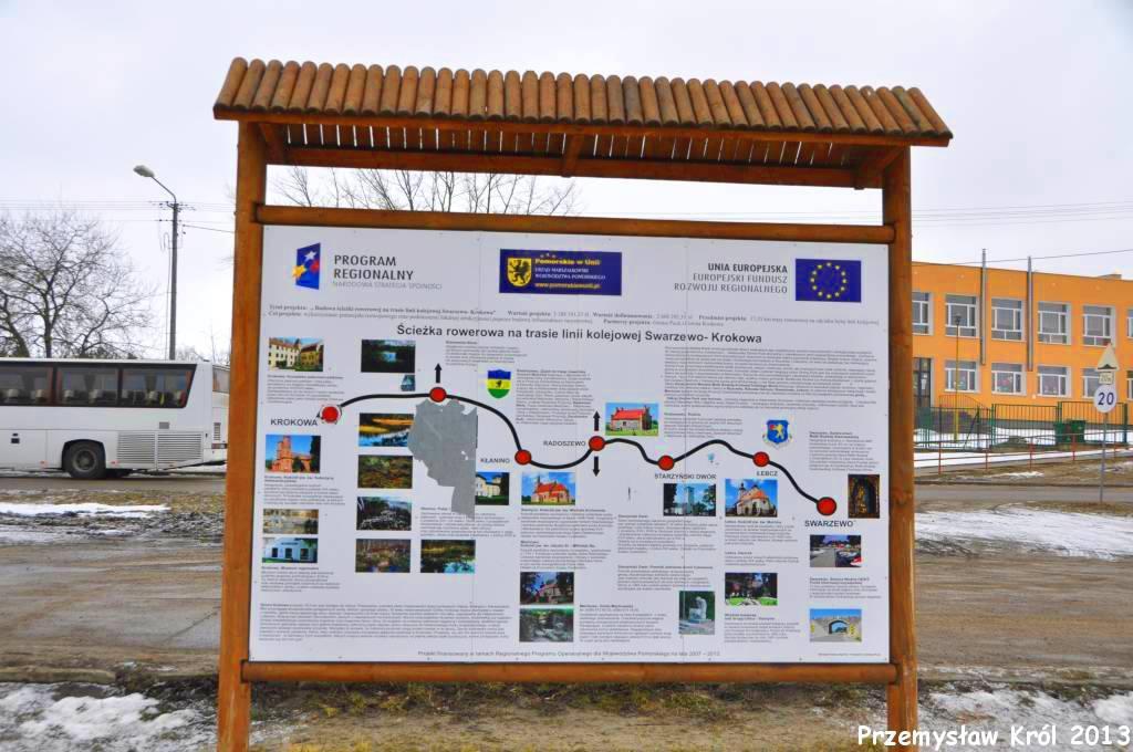 Opis ogólny: Jednostanowiskowa parowozownia istniała do II wojny światowej. Budynek dworca piętrowy z przybudówkami na chlew i magazyn towarowy. Na piętrze mieściły i mieszczą się do tej pory mieszkania kolejarzy. Jeden peron dwukrawędziowy. Obecnie stacja jest bazą dla Kolei Drezynowej, czyli Inicjatywy Klubu Turystyki Kolejowej Tendrzak. (ŚK 5/2002) dokładnie, to jeden semafor był :) (info: KMR, 2005-02-19) Opis infrastruktury: Listopad 2005 - rozbiórka linii rozpoczęta w Krokowej. (info: Wojciech Koliński, 2005-12-02) |