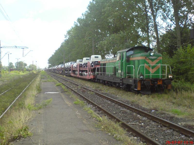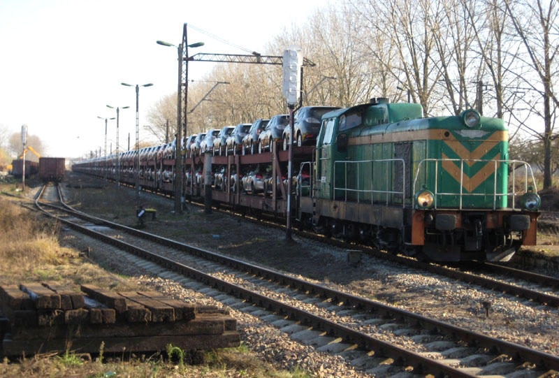 Fotka składu aut na stacji we Mszczonowie (linia 604), które później zostały przetoczone na bocznice składu Toyoty w dzielnicy przemysłowej miasta. Widok w kierunku wschodnim (Tarczyn/Pilawa).