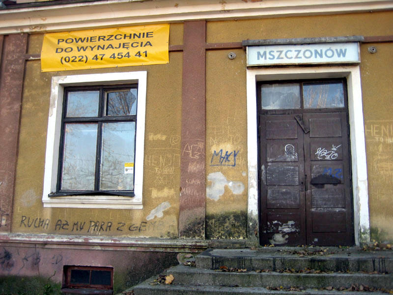 Budynek dworca PKP w Mszczonowie z przybudówką nastawni dysponującej. Widok od strony peronów, w kierunku północnym; w lewo Skierniewice i CMK, w prawo Tarczyn/Pilawa.