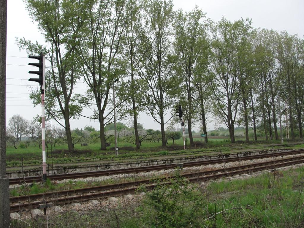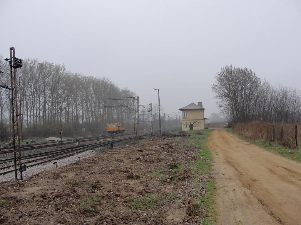 Nastawnia wykonawcza w Mszczonowie, stojąca na wjeździe z Tarczyna/Pilawy (za plecami). Widok w kierunku zachodnim.