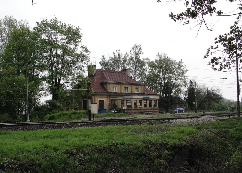 Budynek dworca z przybudówką nastawni od strony peronów. Widok w kierunku północnym; w lewo Skierniewice i CMK, w prawo Tarczyn.