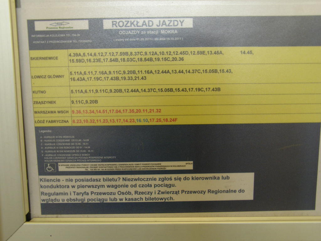 Rozkład jazdy ważny od 1-09-2011 do 15-10-2011. Najdłuższa relacja - Zbąszynek 316 km. Zamiast Łódź Fabryczna chyba powinno być wpisane Koluszki (większość pociągów kursuje przez Łódź Widzew i Łódź Kaliską do Wrocławia Głównego, a część przez Częstochowę do Katowic).