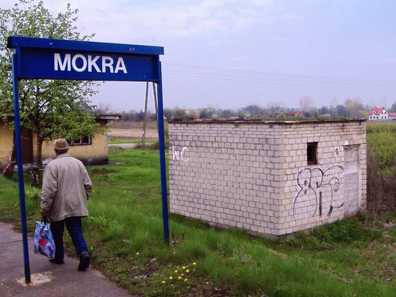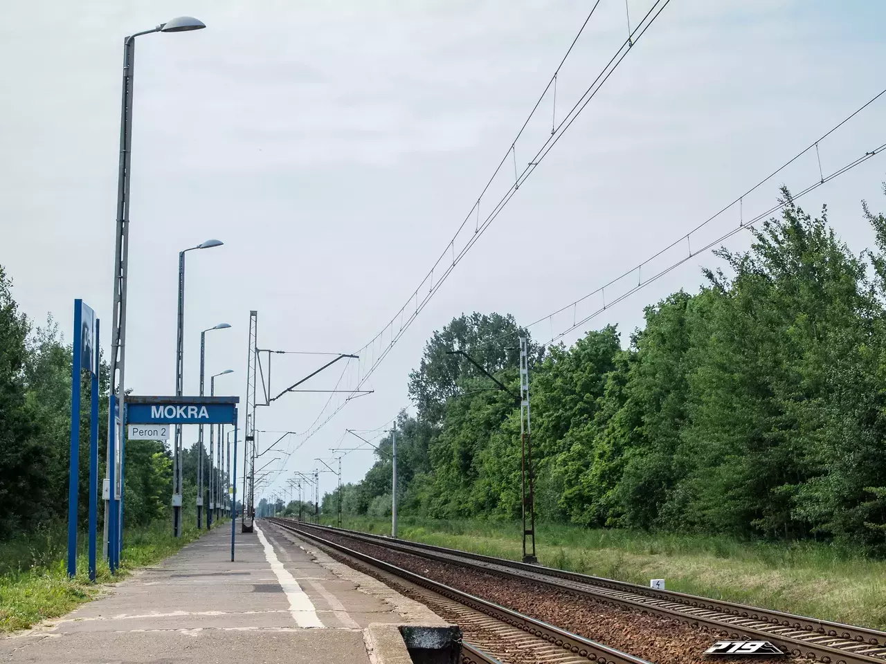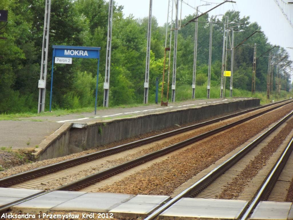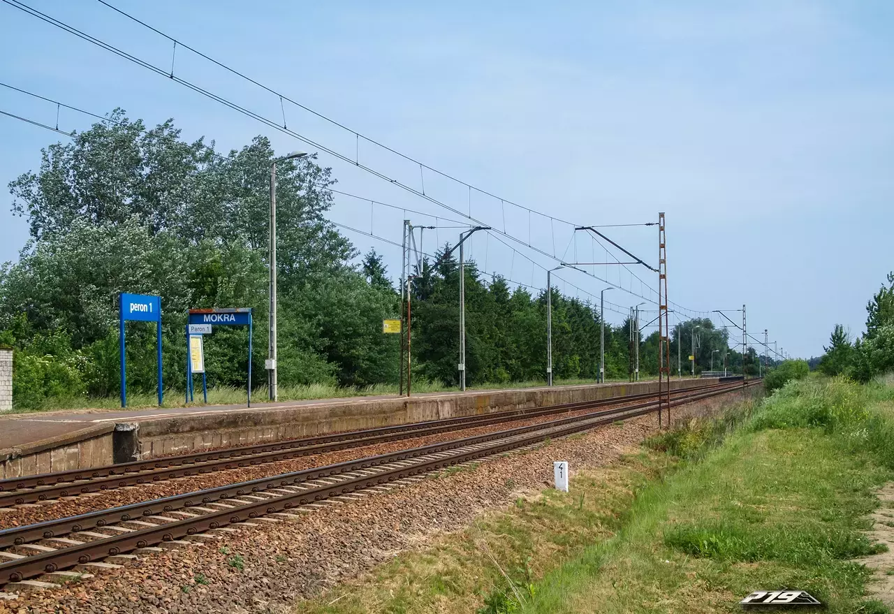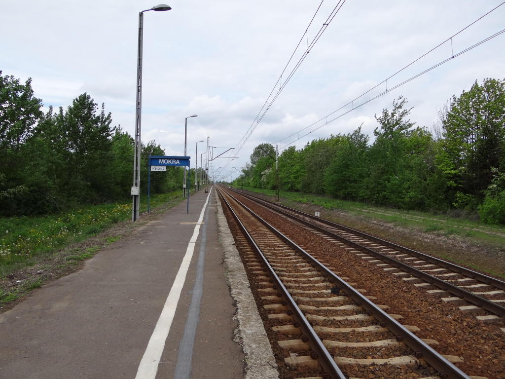 Peron dla pociągów w kierunku Łowicza (bliżej). Budynek dworcowy. Przejazd drogowy w Mokrej. Po lewej parking na ok. 10 miejsc. Peron dla pociągów w kierunku Skierniewic. Widok w kierunku Łowicza. 4,1 km.