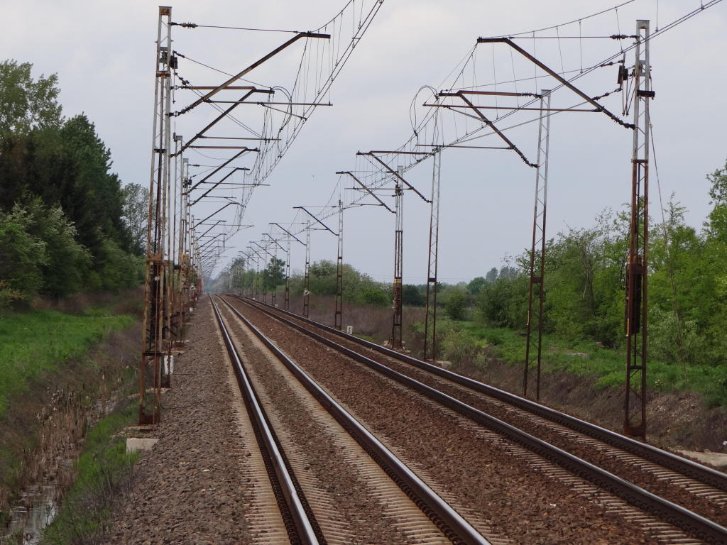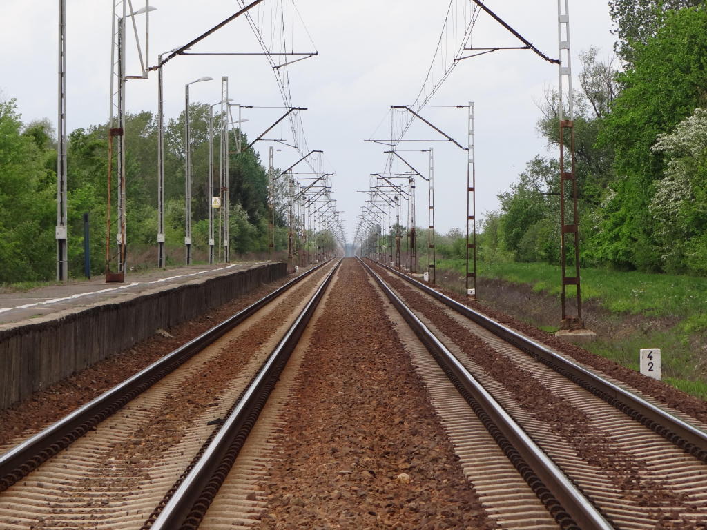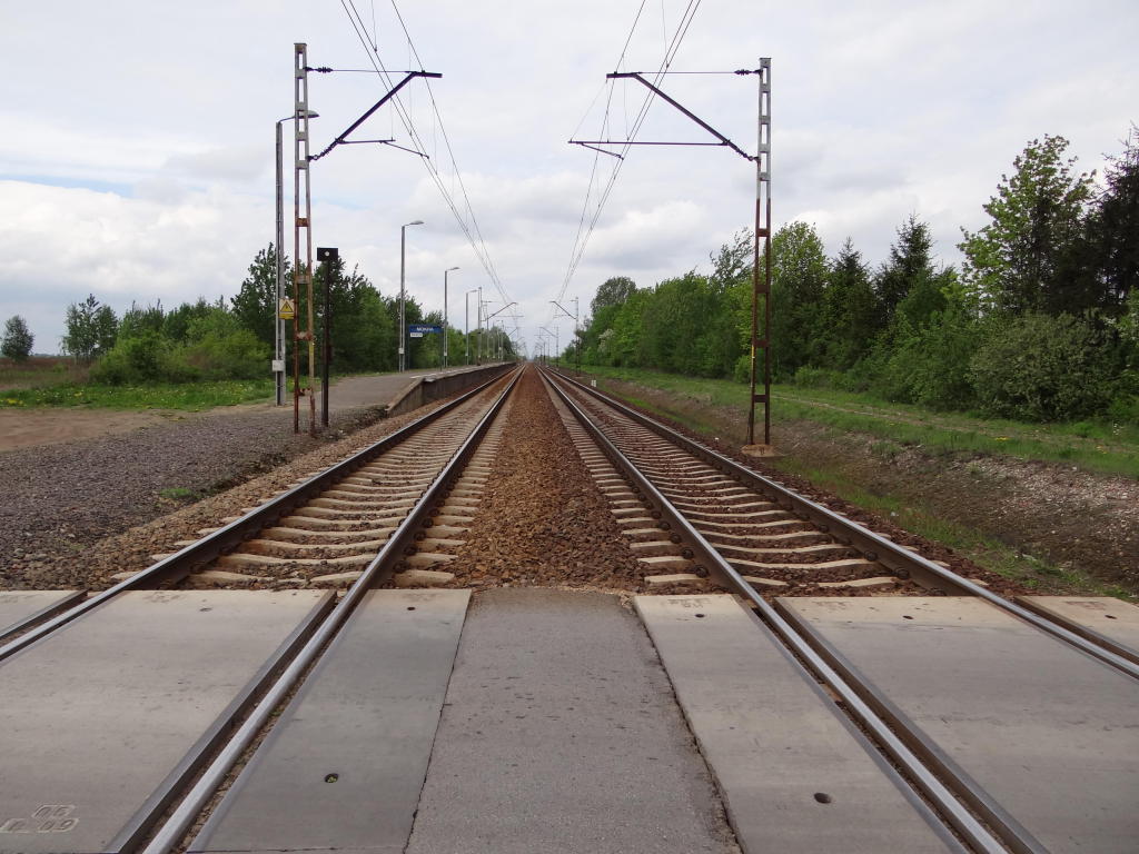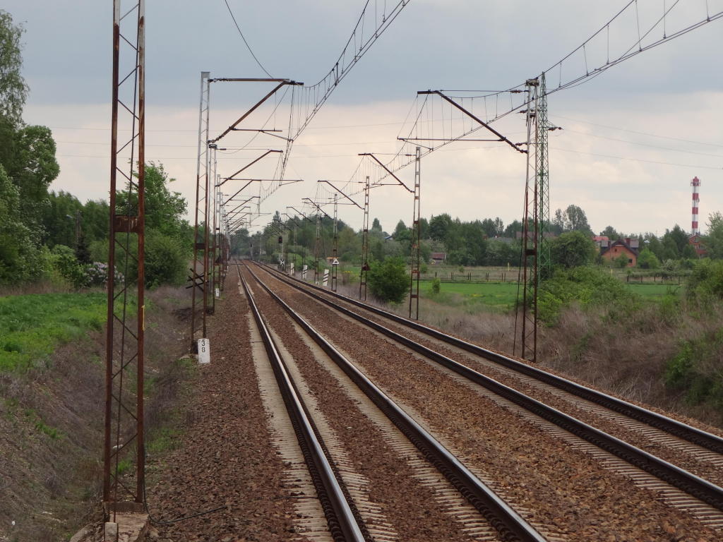 Tory szlakowe. W oddali tarcza ostrzegawcza odnosząca się do semafora wjazdowego posterunku odgałęźnego Skierniewka. Widok w kierunku Skierniewic. 3,8 km.