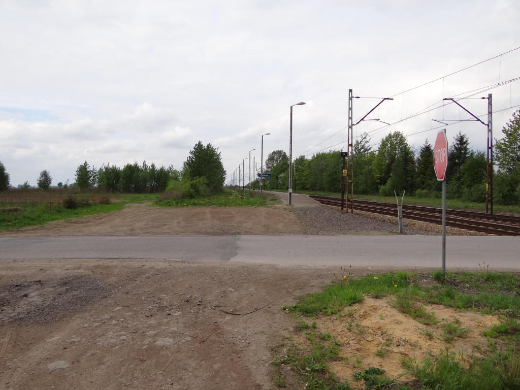 Przejazd drogowy w Mokrej. Po lewej parkin na ok. 10 miejsc. Peron dla pociągów w kierunku Skierniewic. Widok w kierunku Łowicza. 4,1 km.