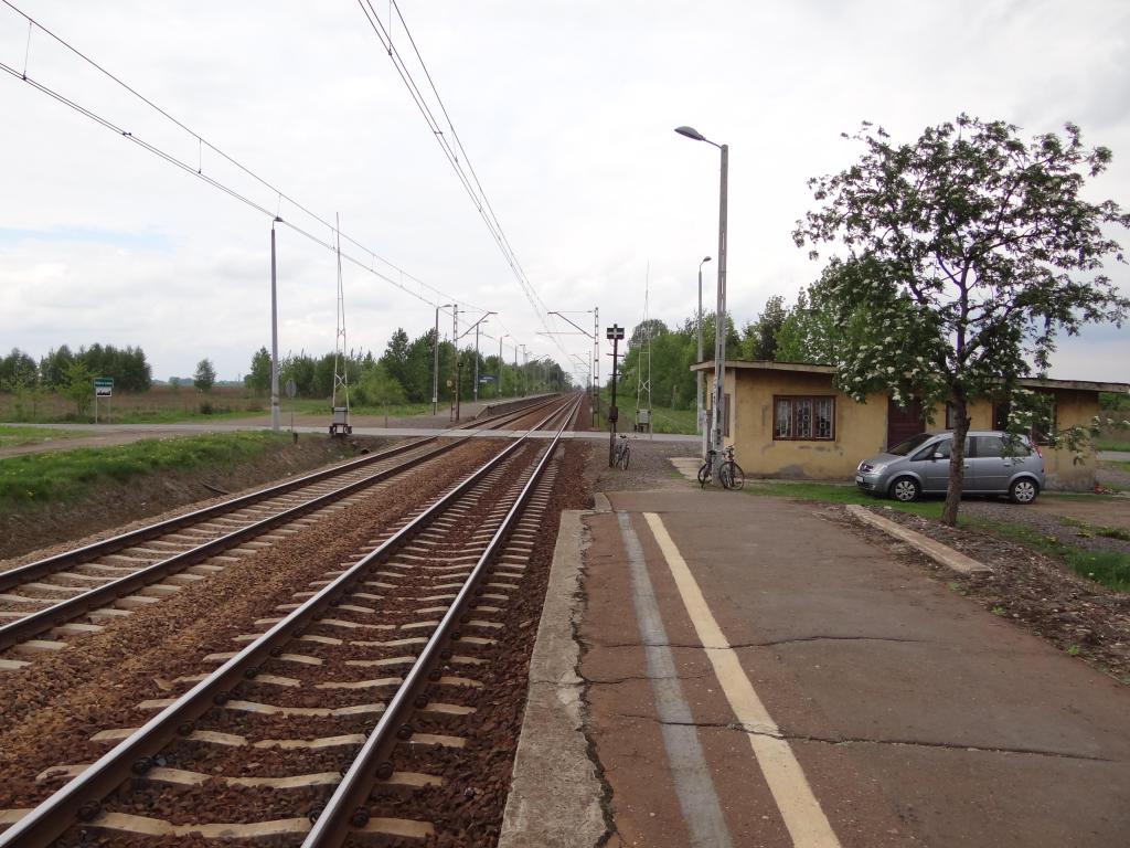 Peron dla pociągów w kierunku Skierniewic. W oddali budynek dworcowy. Widok w kierunku Skierniewic. 4,3 km.