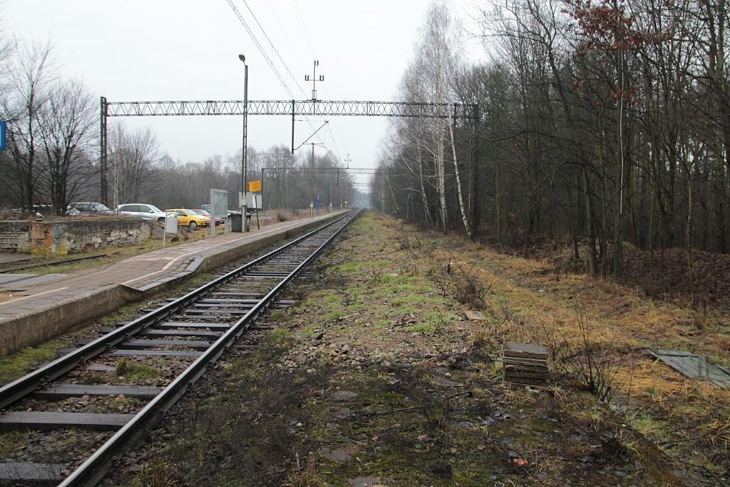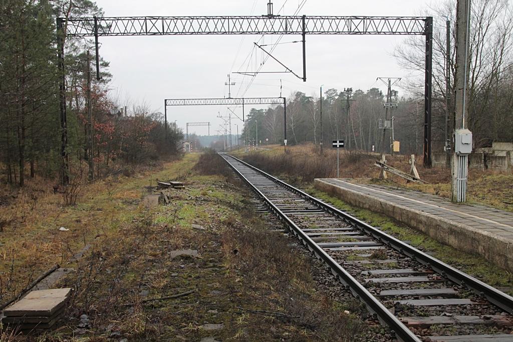 Widok z przejazdu, na drodze między Parkowem a Wełną (droga krajowa nr 11) w stronę peronów, po prawej stronie ślad po drugim torze. Widok w kierunku północno-wschodnim (Rogoźno Wlkp./Piła).