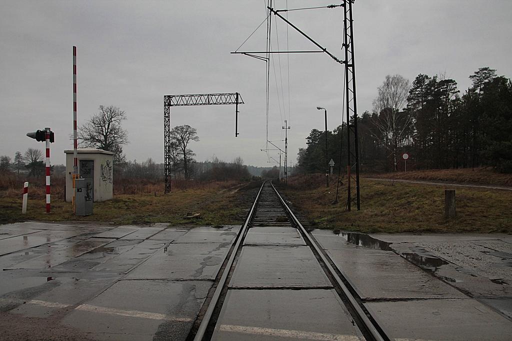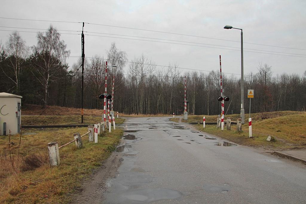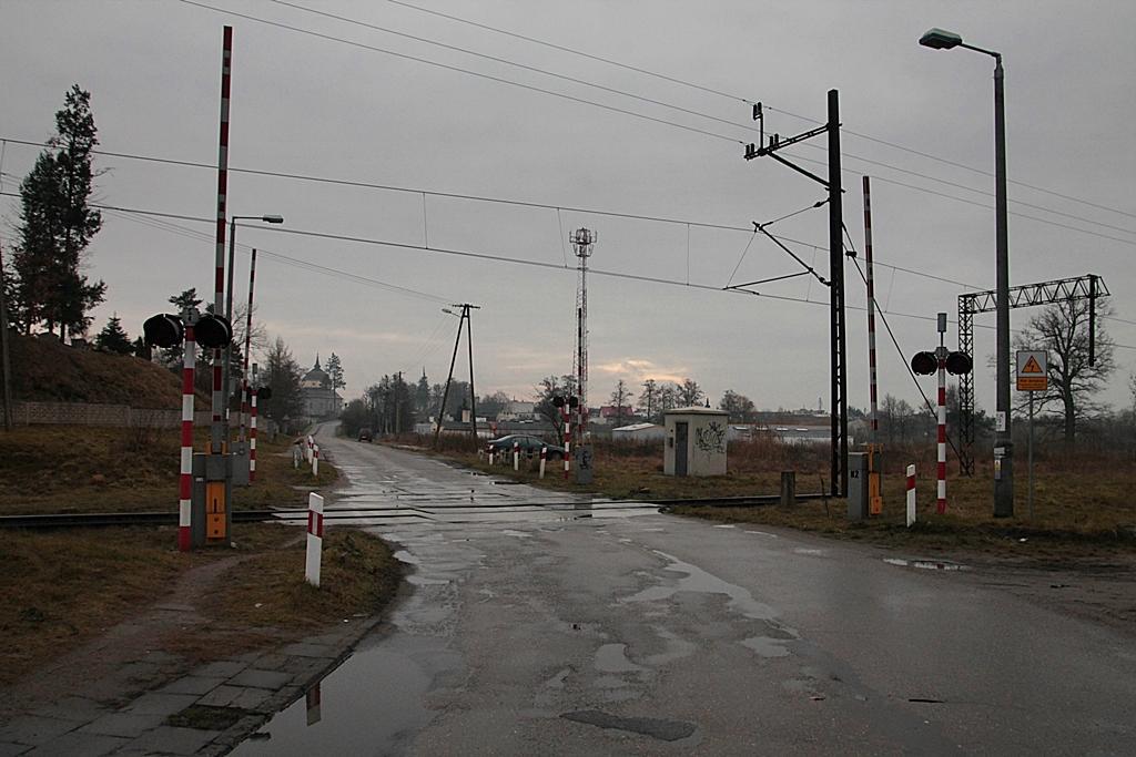 Przejazd kolejowy na drodze od strony Wełna/droga krajowa nr 11. W lewo perony, w prawo Oborniki Wlkp./Poznań.