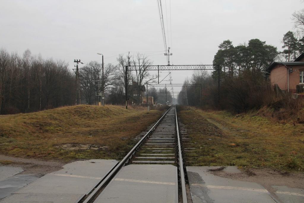 Widok z przejazdu na drodze Parkowo - Wełna/droga krajowa nr 11, po lewej stronie ślad po drugim torze. Widok w kierunku południowo-zachodnim (Oborniki Wlkp./Poznań).
