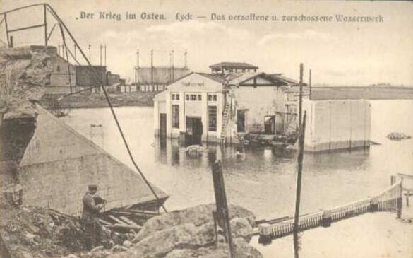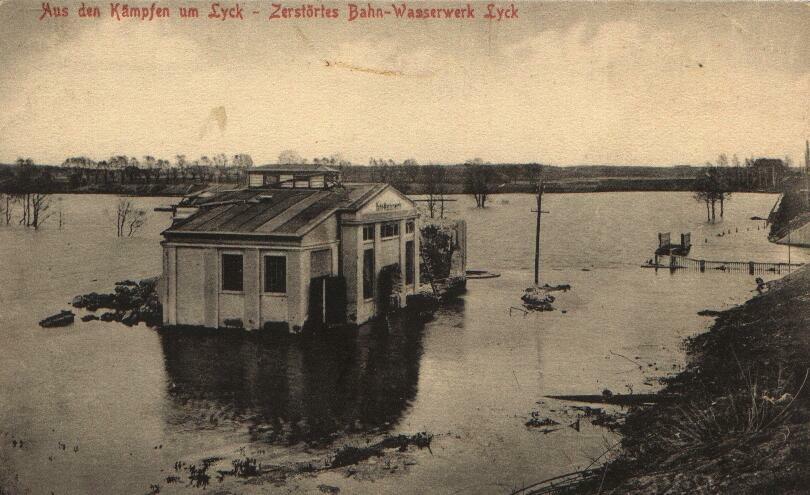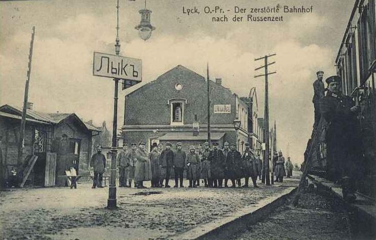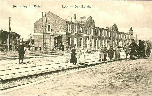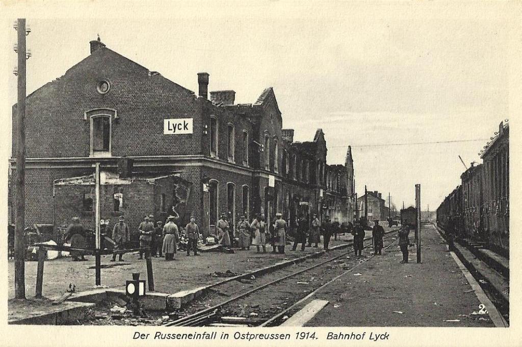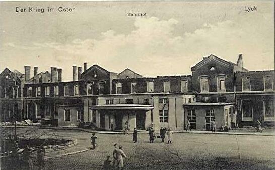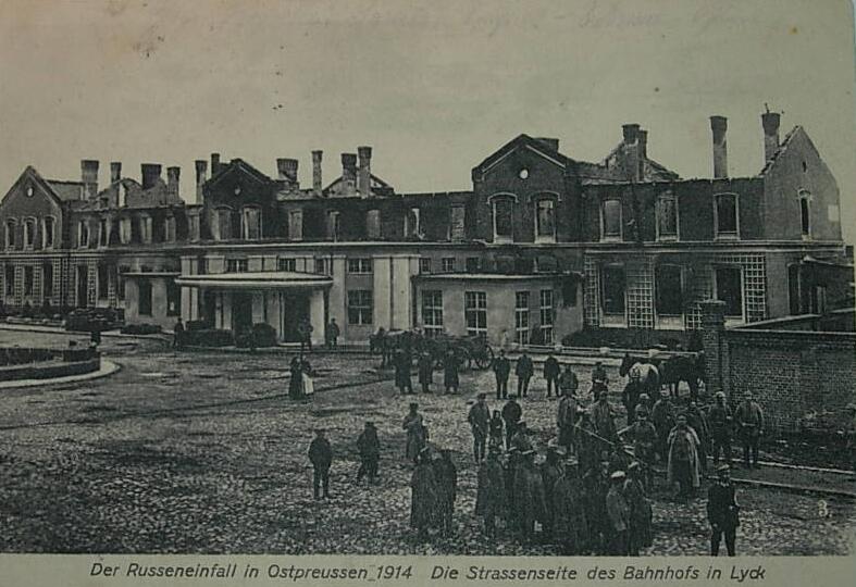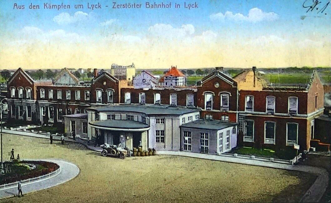 Zniszczony dworzec w Ełku. Jeżeli kolory na zdjęciu oddają rzeczywistość, widać na nim, jakie barwy miała elewacja dworca przed I w. św. W dali (z pomarańczowym dachem) widać dworzec Lycker Kleinbahn - Ełckiej Kolejki Wąskotorowej. Pocztówka w zbiorach Muzeum Historycznego w Ełku.