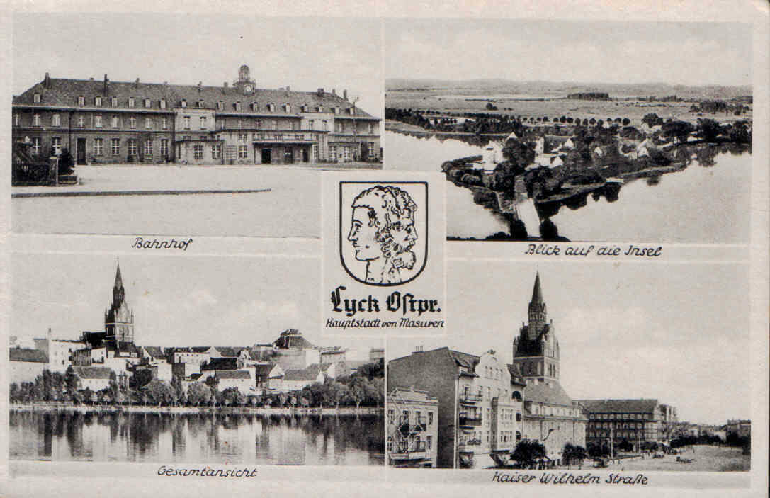 Pocztówka z Ełku. Na lewym górnym zdjęciu widać dworzec.